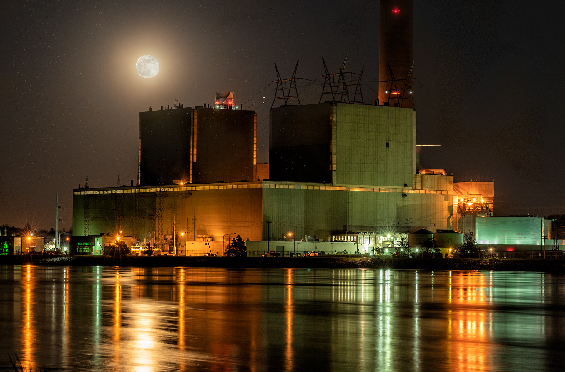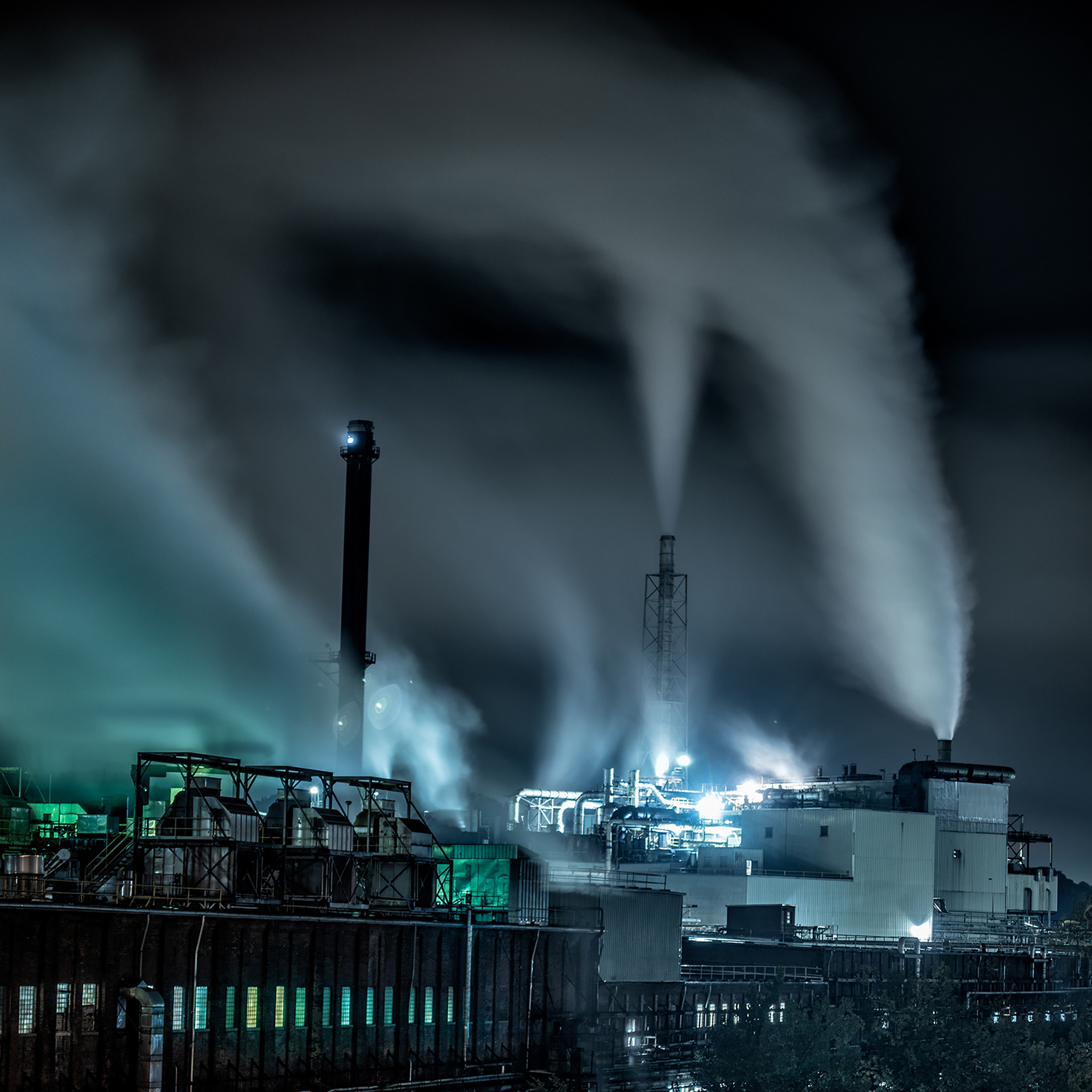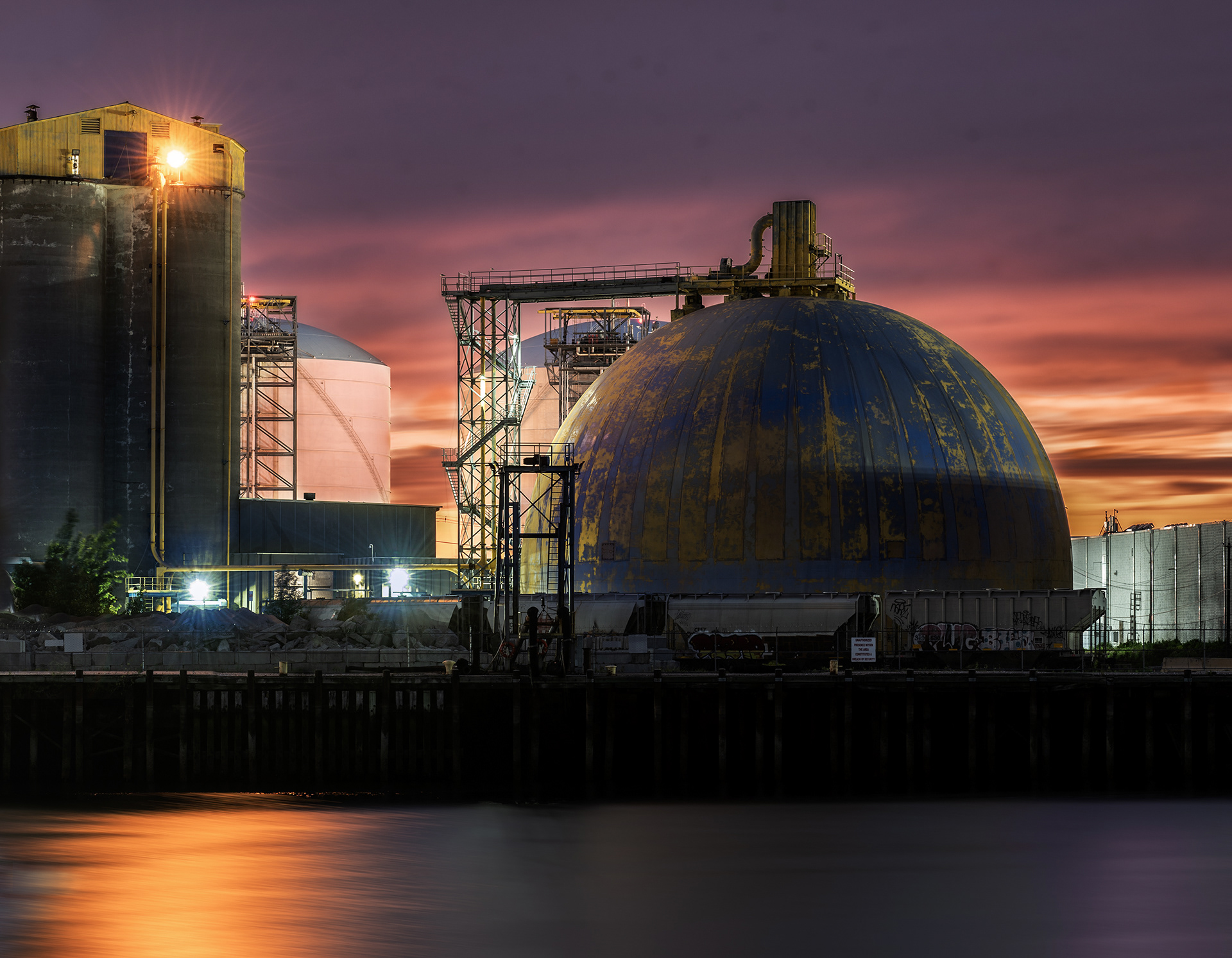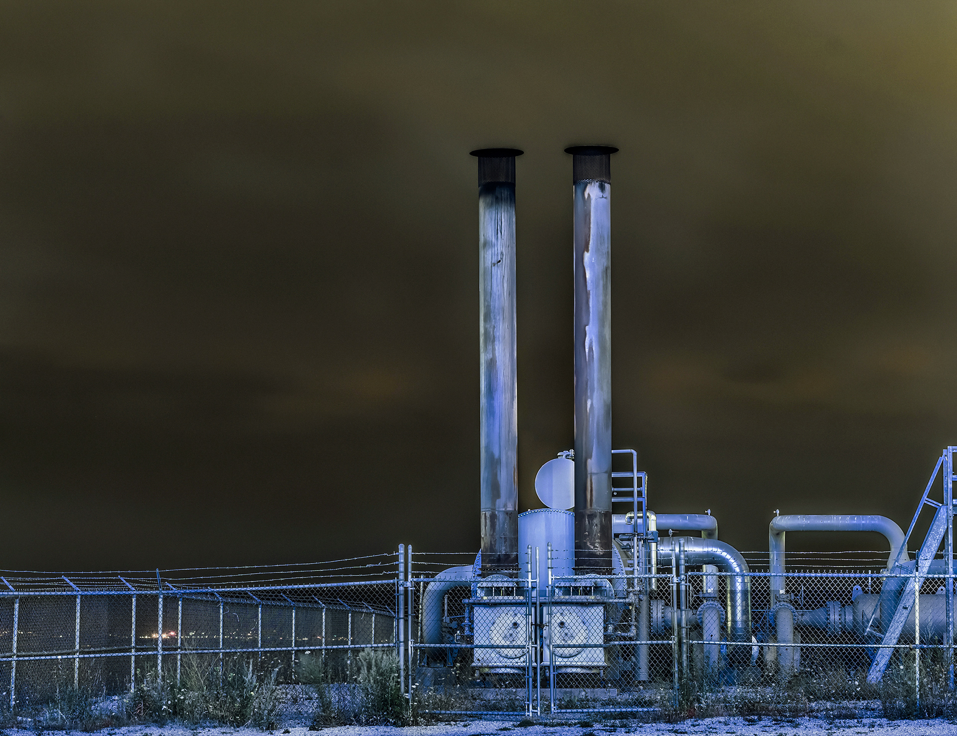 At night industrial sites sparkle and radiate intense colors.