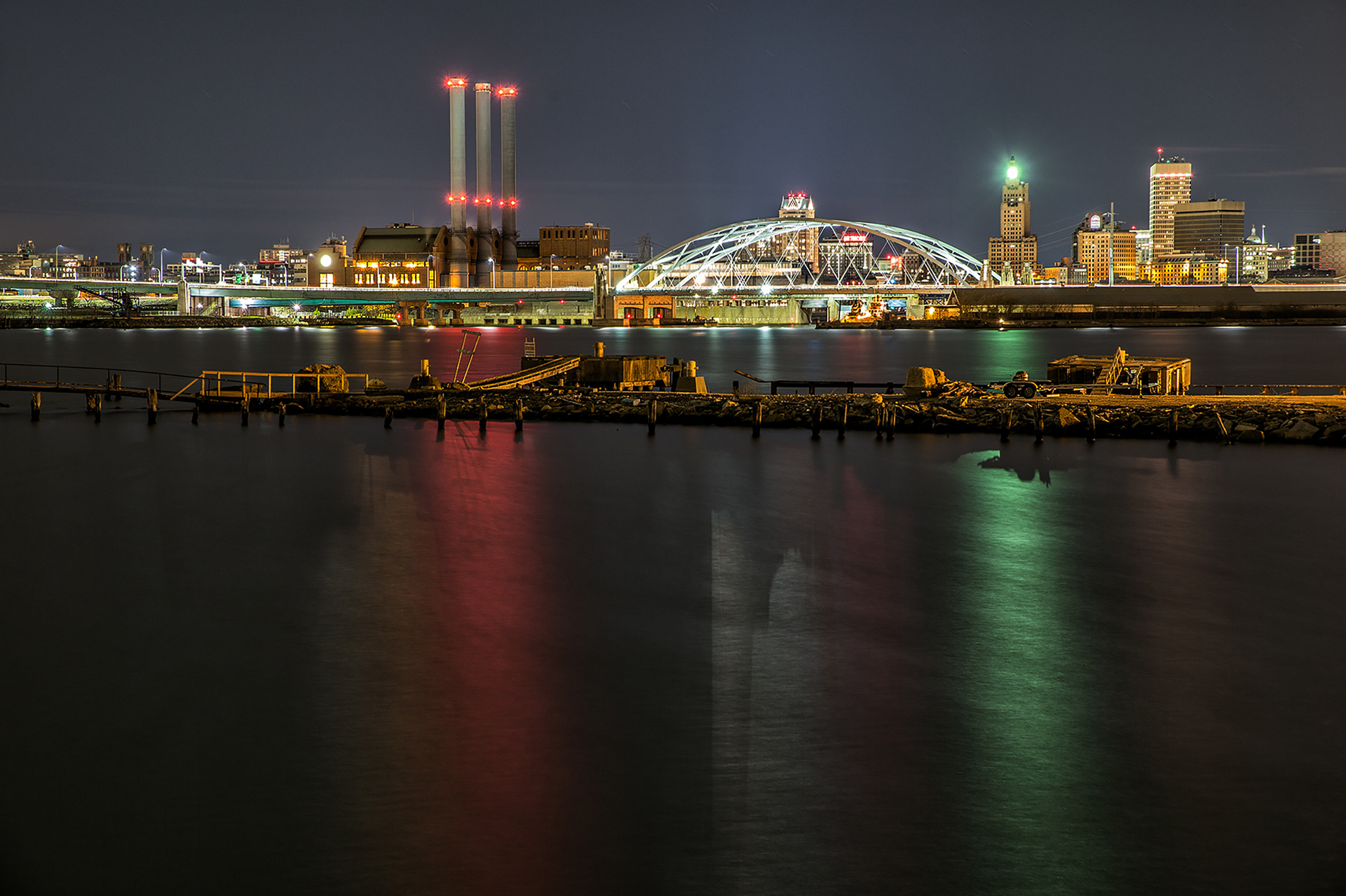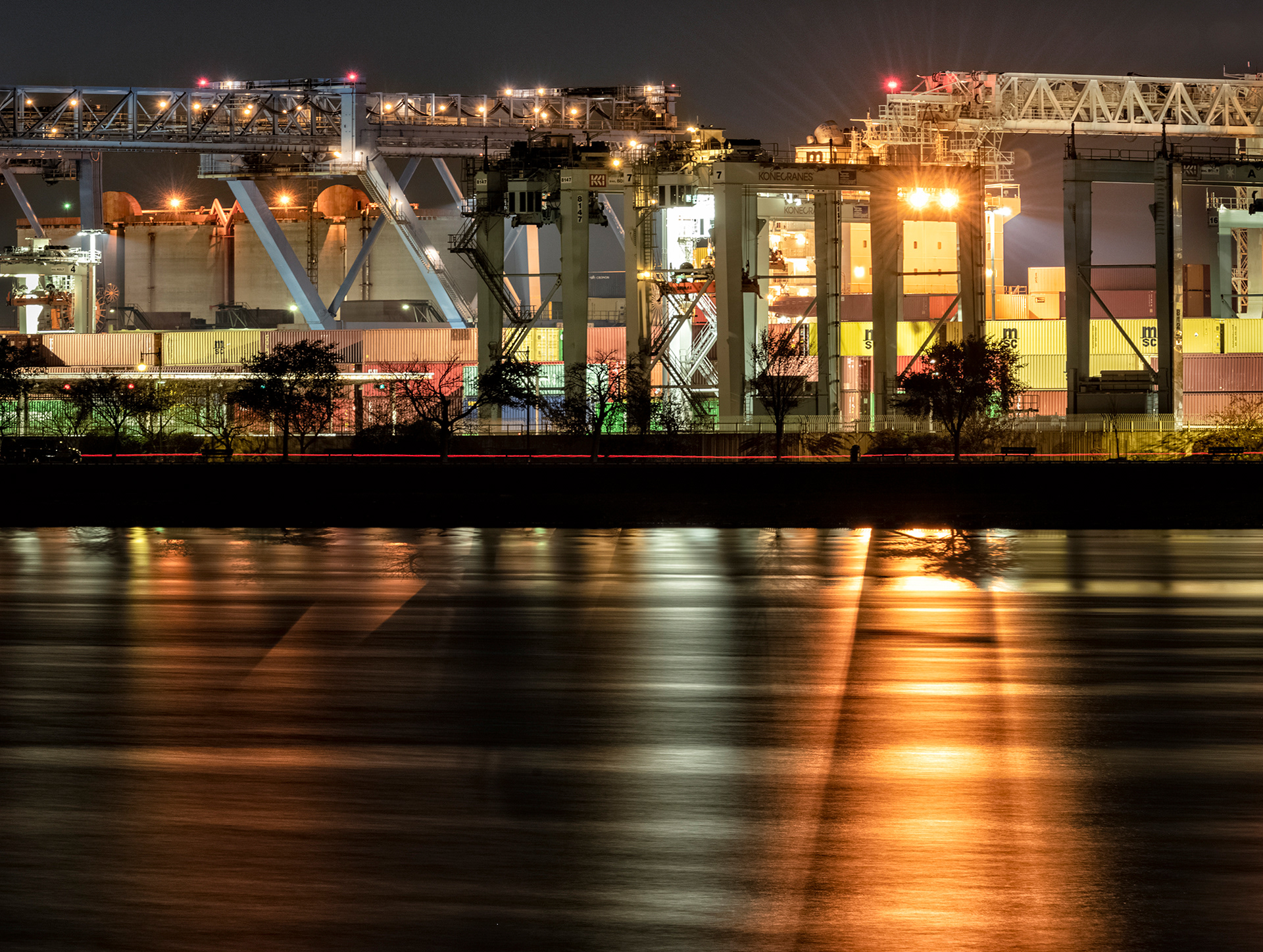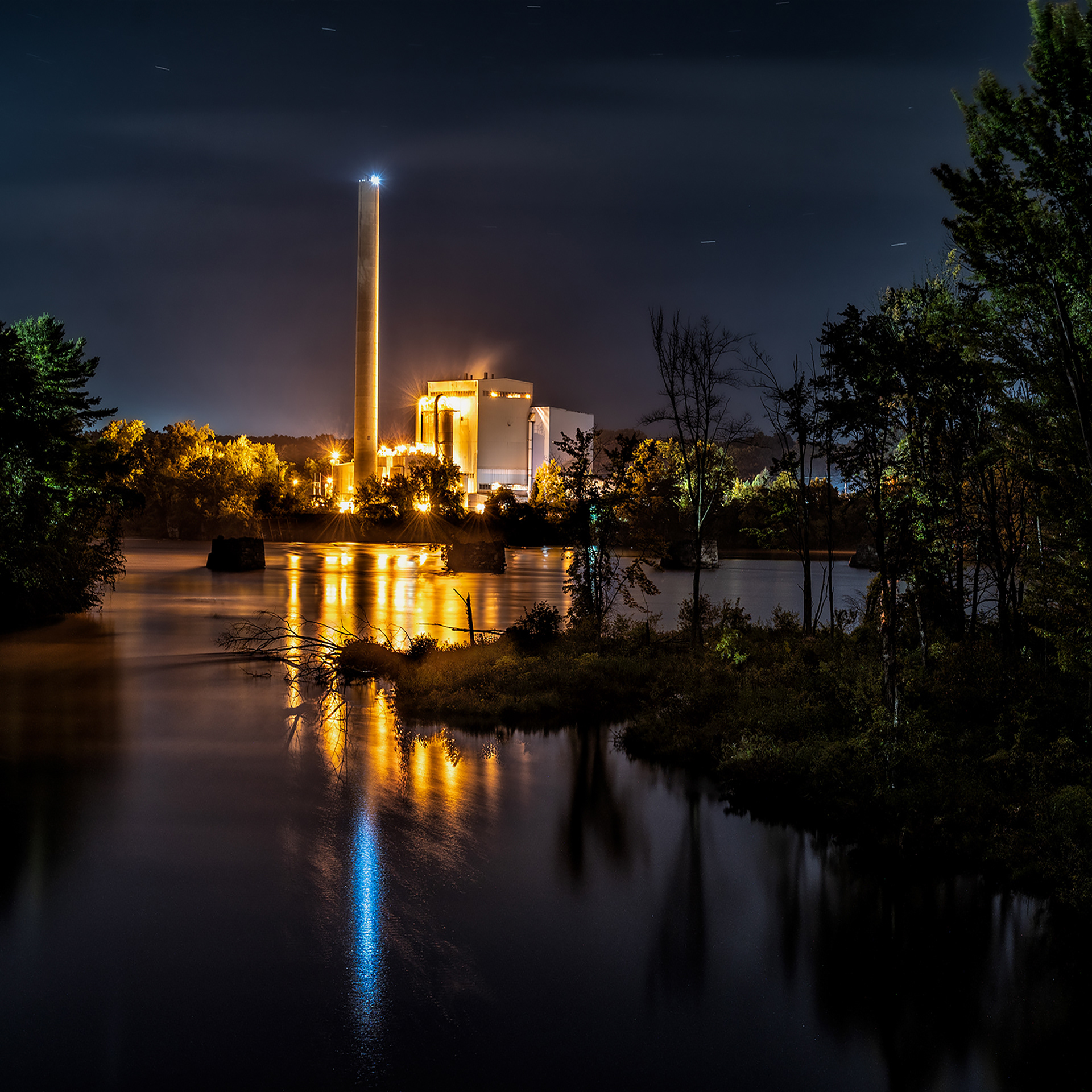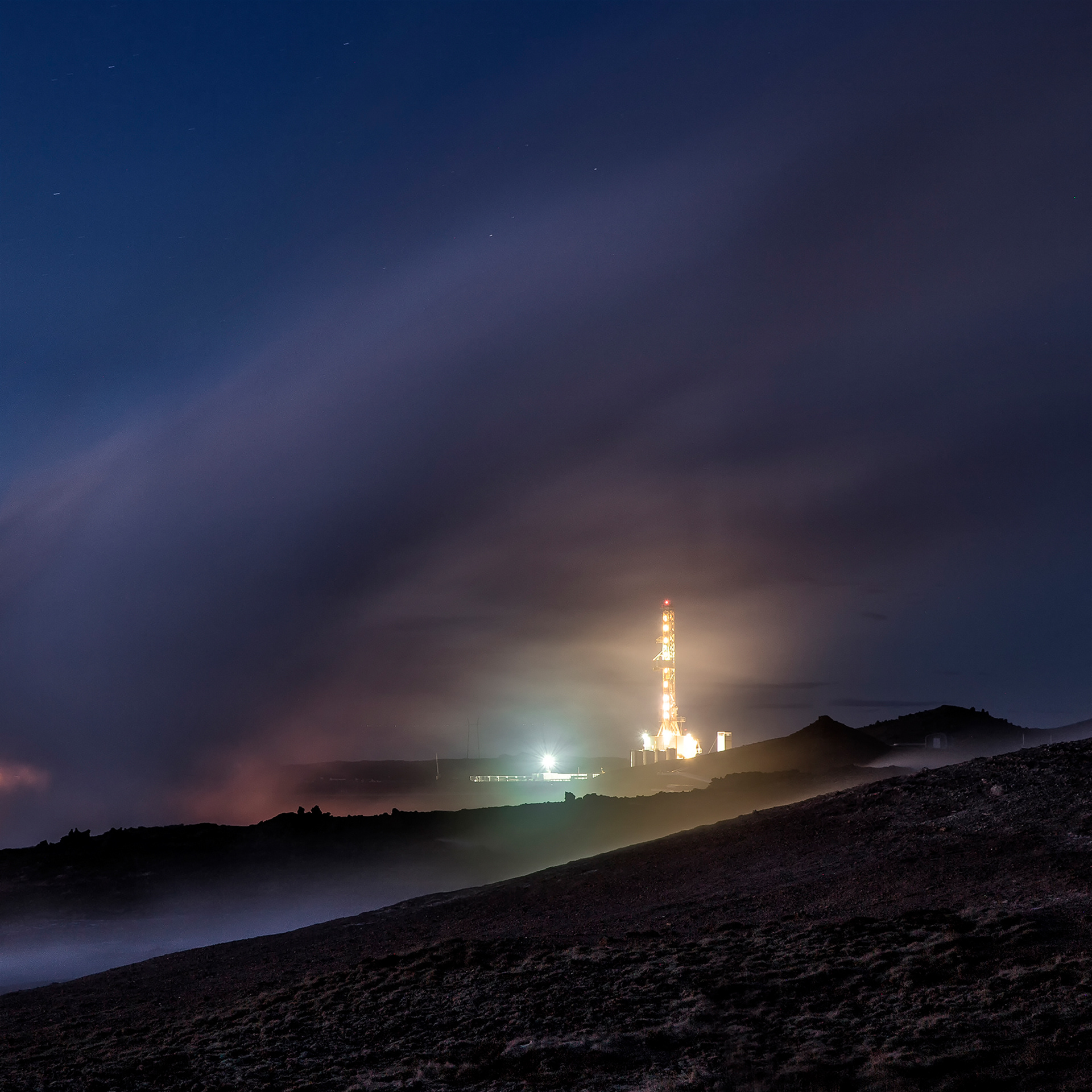 At night industrial sites sparkle and radiate intense colors.